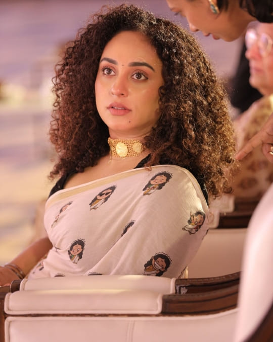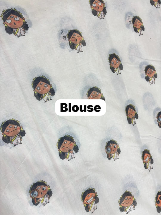 The fun, sketch-like illustrations scattered across the saree add a youthful, contemporary twist to the traditional silhouette, making it perfect for those who love to mix heritage with personal style. The saree is finished with a subtle golden zari border, giving it just the right touch of festive elegance.