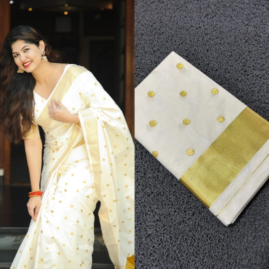 The subtle shimmer of the golden zari polka dots adds depth and texture without overpowering the minimalist elegance of the saree. Complemented by a classic Kasavu gold zari border, this saree is perfect for those who love a unique, refined look with a modern edge.